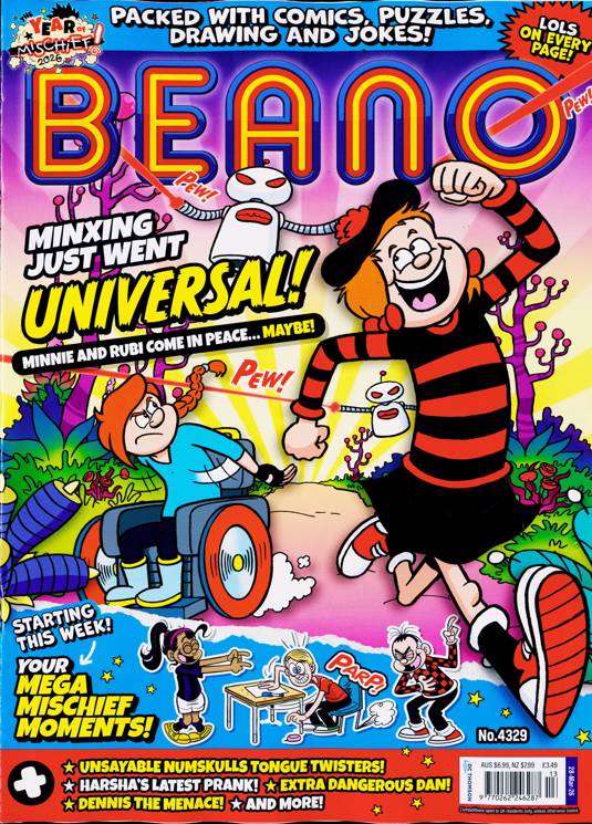 Trundle down to Beanotown today and pick up a Beano comic magazine – the iconic kid’s comic, for the kids (and big kids – yes we’re talking to you!). Everyone remembers the Beano from their childhood days – with crazy classic characters such as Dennis the Menace, Roger the Dodger, Minnie the Minx, The Bash Street Kids, Calamity James, Ivy the Terrible and Billy Whizz to name but a few, you can bring the Beano into the next generation as the comic that’s become an integral part of being a kid.