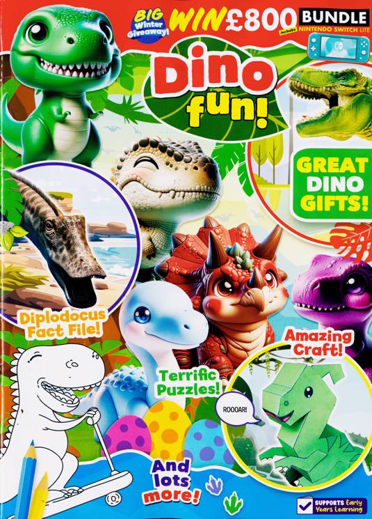 Buy a single copy of DINO FUN or a subscription of your desired length, delivered worldwide. Current issues sent same day up to 3pm! All magazines sent by 1st Class Mail UK or 48 Hour tracked UK & by Airmail worldwide (bar UK over 750g and children's magazines with large free gifts which may go 2nd Class).