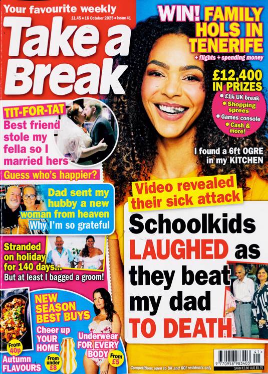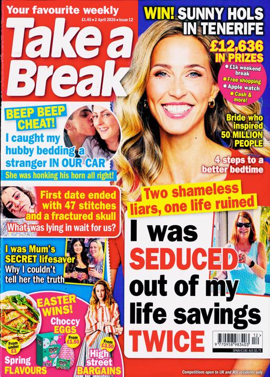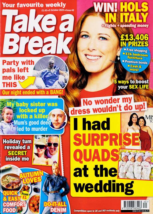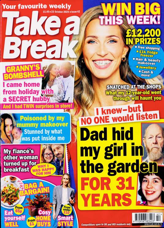 Buy a single copy of TAKE A BREAK or a subscription of your desired length, delivered worldwide. Current issues sent same day up to 3pm! All magazines sent by 1st Class Mail UK or 48 Hour tracked UK & by Airmail worldwide (bar UK over 750g which may go 2nd Class).
