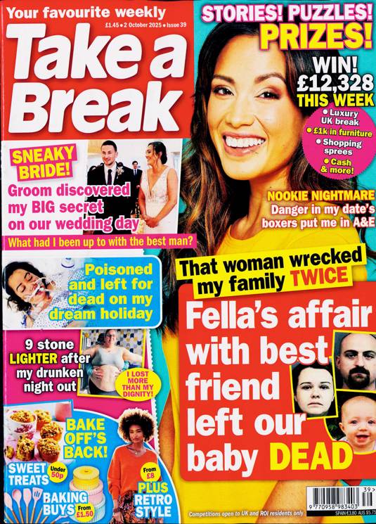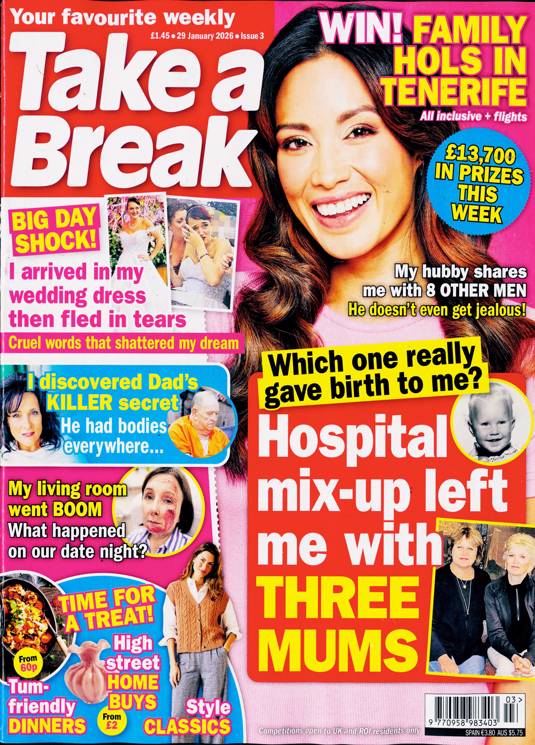 Buy a single copy of TAKE A BREAK or a subscription of your desired length, delivered worldwide. Current issues sent same day up to 3pm! All magazines sent by 1st Class Mail UK or 48 Hour tracked UK & by Airmail worldwide (bar UK over 750g which may go 2nd Class).
